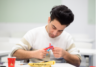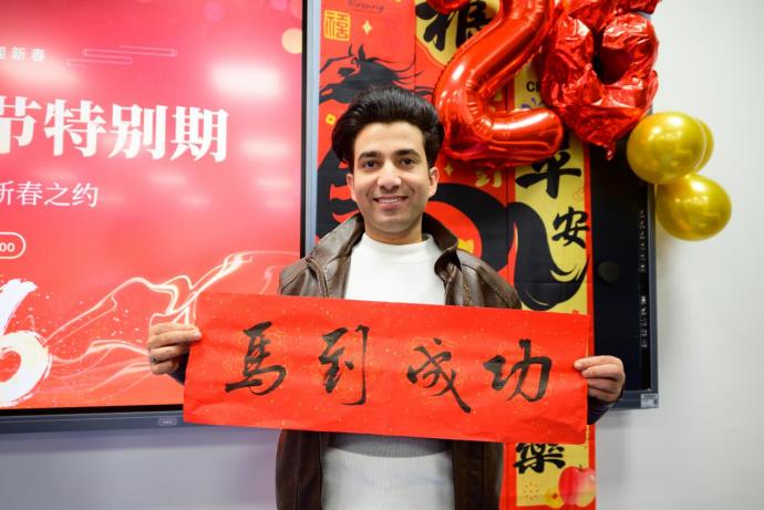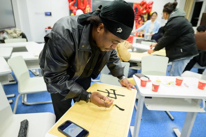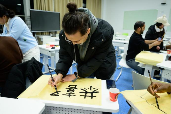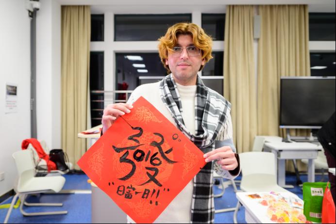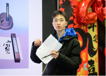 楹联雅趣,笔墨传情。中国学生白梦琪分享了春节对联的趣味典故与创作规则,拆解楹联对仗、平仄的独特魅力,带领大家感受中华语言文字的博大精深。随后,书法资深爱好者郭起隆现场指导大家的书法体验,笔墨流转间,学子们纷纷提笔尝试书写春联、福字,不少学子虽是初次握毛笔,却格外认真,在一笔一画中触摸中华书法的韵味,定格新春祝福。
